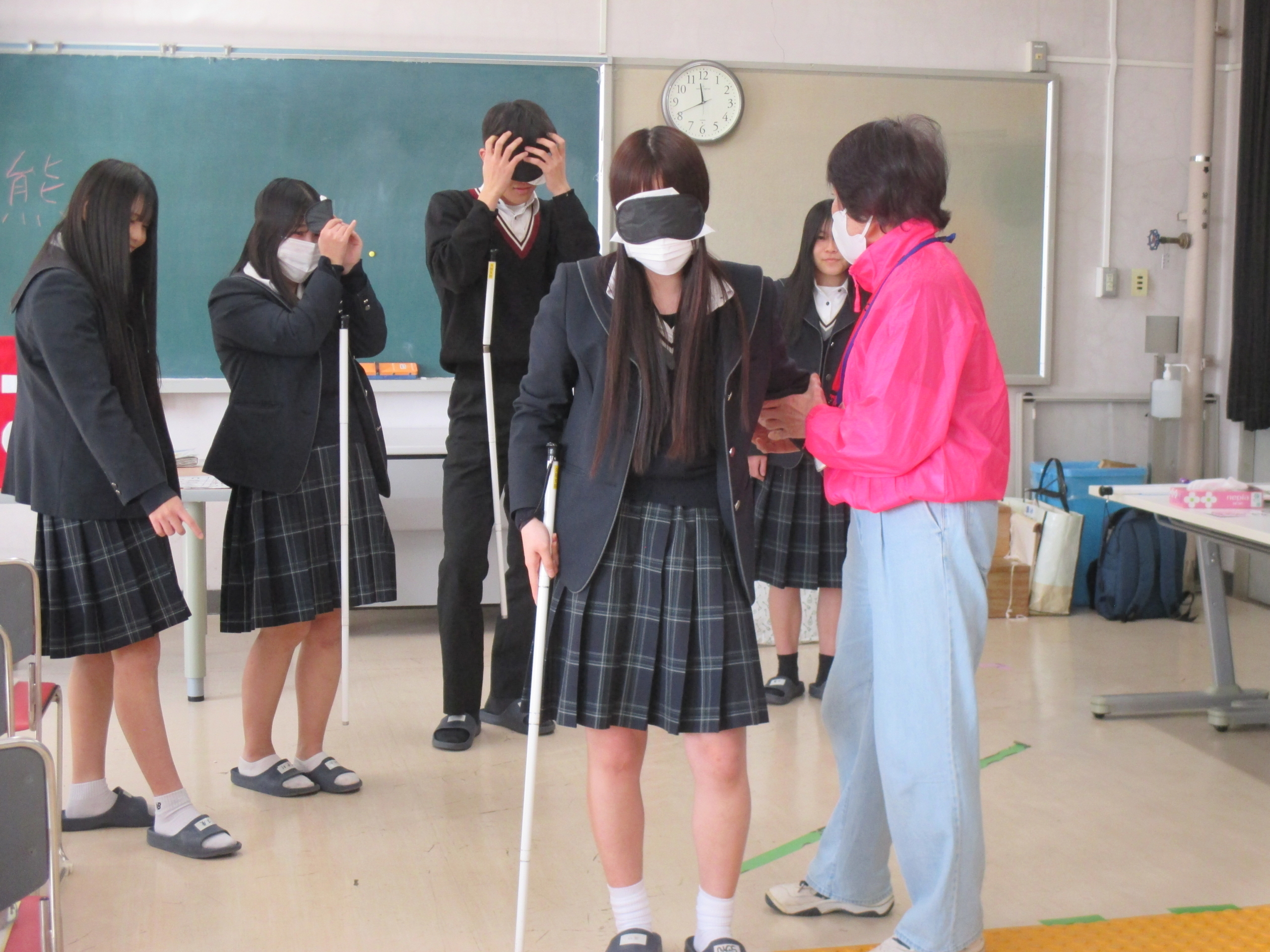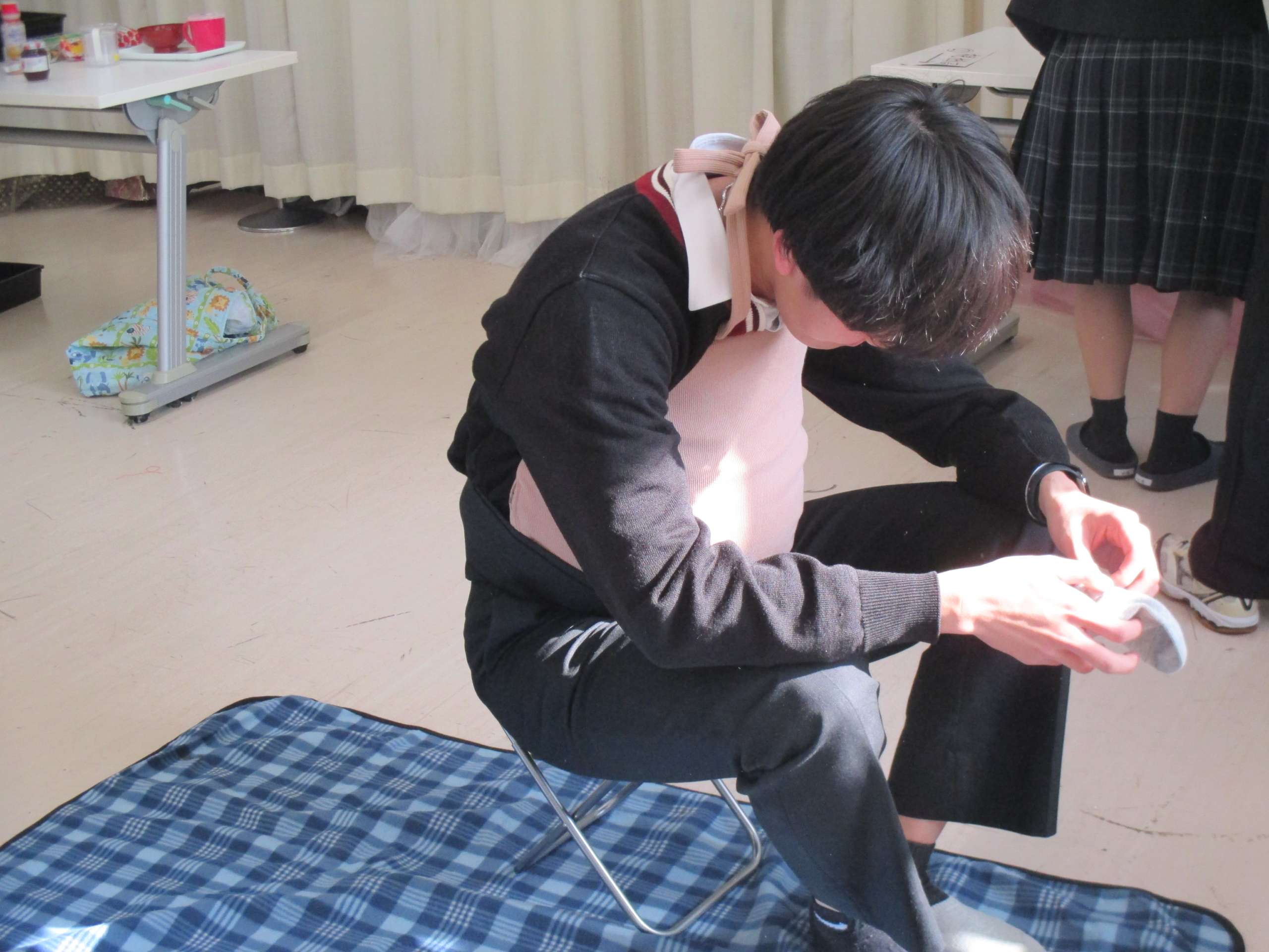 1月19日(月)津市社会福祉協議会久居支部様の出前講座として、高齢者体験・視覚障がい者体験・妊婦体験を行いました。 白内障のゴーグルを装着したうえに、軍手を二重にはめた状態では、財布からお金を取り出すのにも大変時間がかかってしまいます。レジで高齢者の方がゆっくりと支払いをしていても、あせらせてはいけないということを実感するとともに、「困っている人がいないか」「自分がどう行動すればいいか」を意識する良い機会となりました。