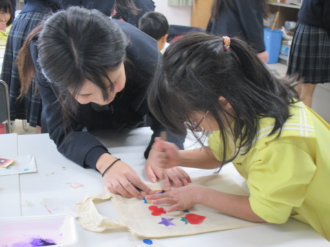 前半は衣生活コースの生徒と一緒に手提げバックにステンシル(型を切り抜いた部分の上からインクをのせていく)をしました。その後、園児が帰るまでに、本校生徒が一人ひとりのイニシャルを刺繍してプレゼントしました。